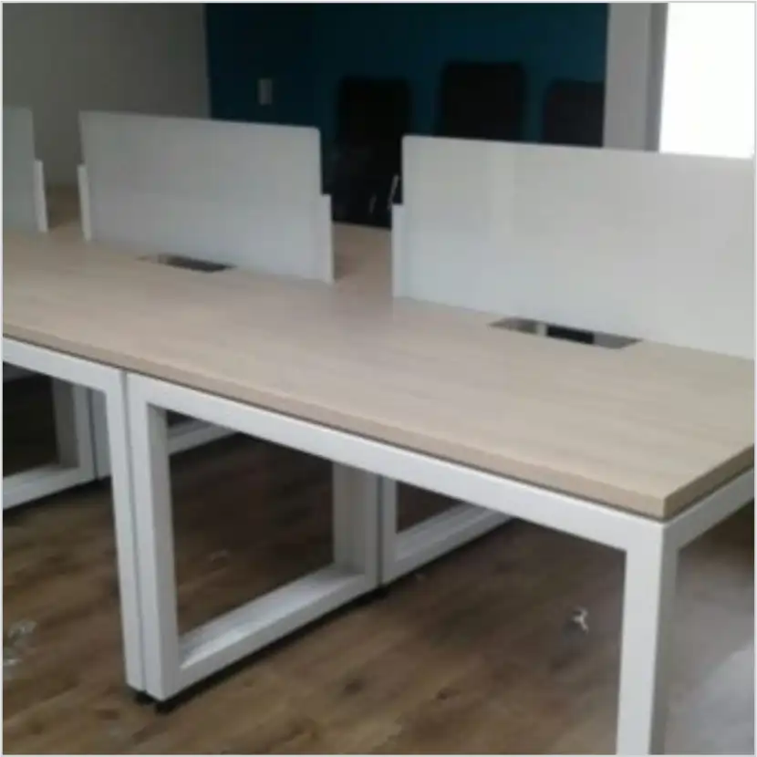 Superficie en melamina color claro de 2.40 x 1.20 m con divisiones centrales en acrílico satinado.