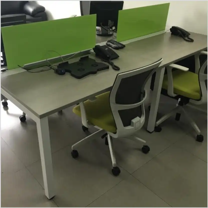 Superficie de trabajo en melamina de alta densidad de 2.40 x 1.20 m, con divisiones centrales en vidrio esmerilado o acrílico.