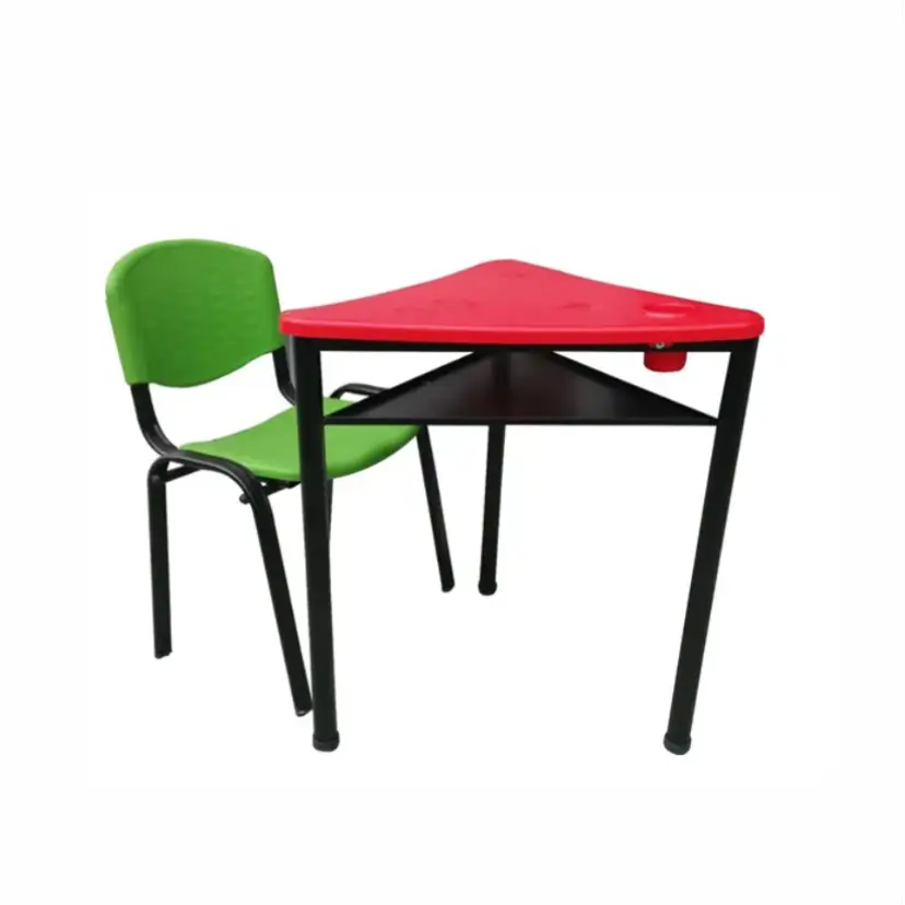 Pupitre unipersonal triangular, mesa y silla independientes, estructura en tubo cold rolled 7/8″ cal 18, pintura en polvo, superficie de mesa y bastidores de silla en polipropileno rígido colores deseado (amarillo 41, rojo 41, verde 41, naranja 41).